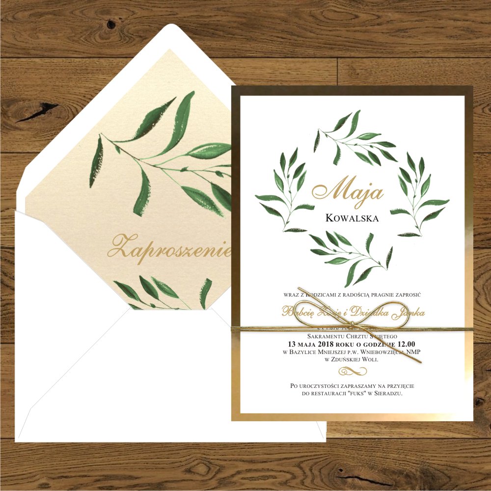 Kod wzoru: Zaproszenia na chrzest. Wianek zielone gałązki delikatne. Jednostronne Koperta wyklejana