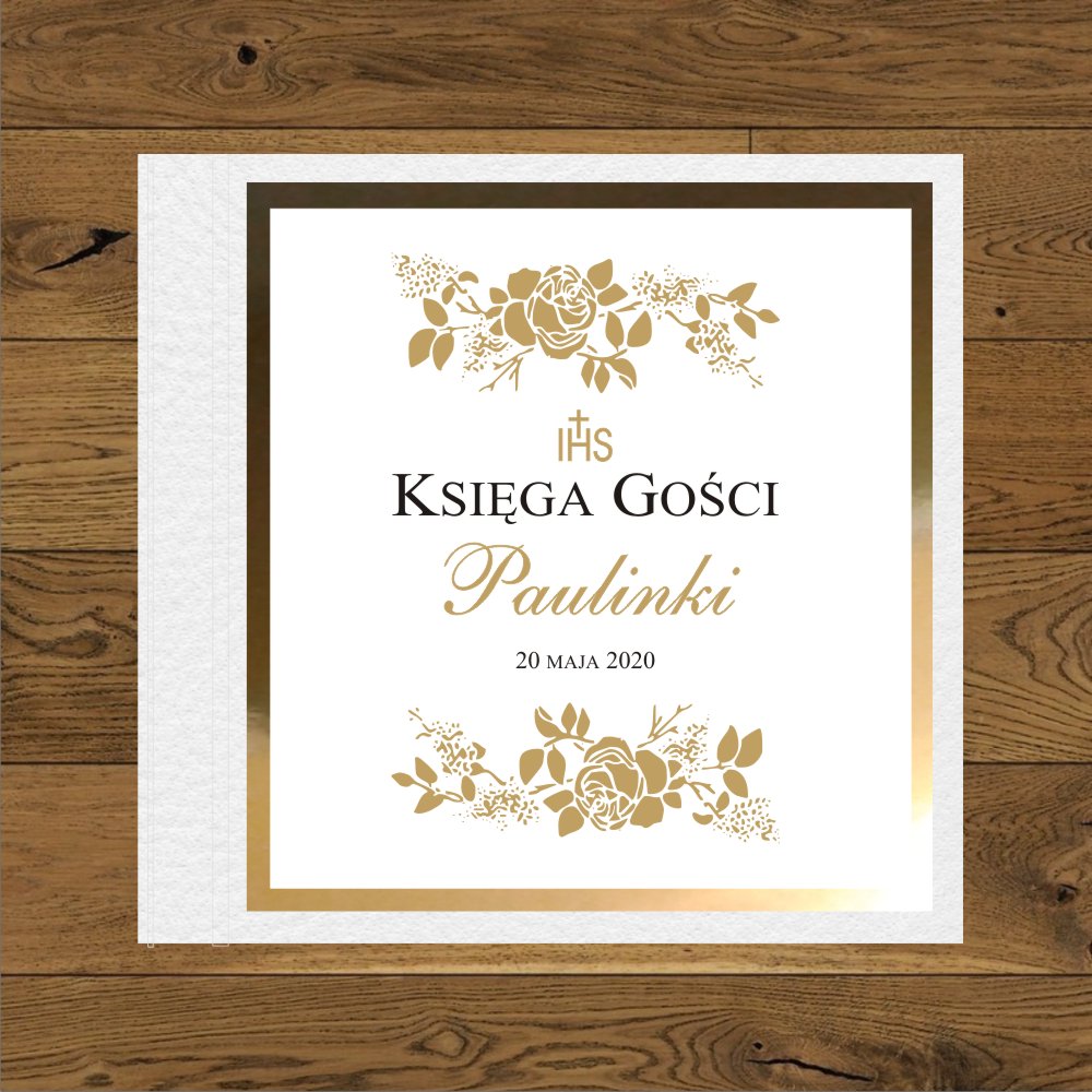 Zaproszenia komunijne eleganckie, glamour. Róże złote. Wzór jednostronny. Koperta wyklejana