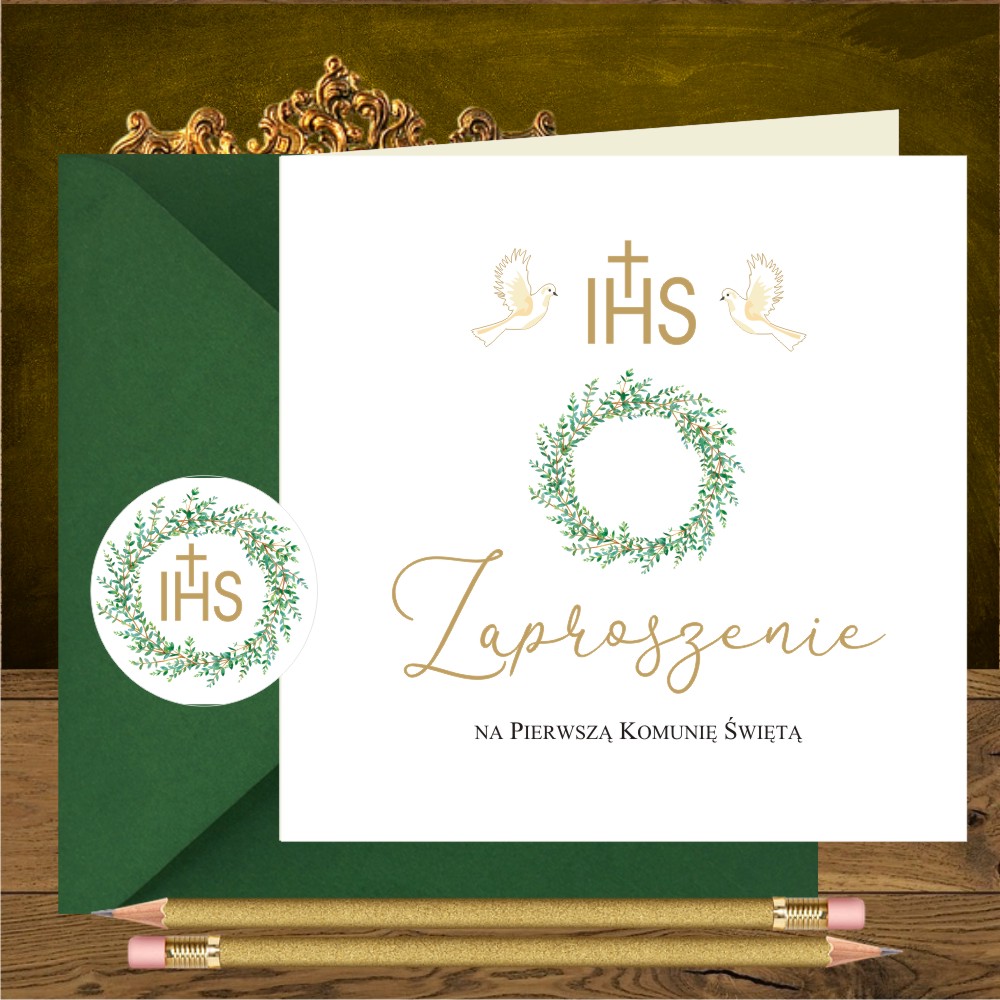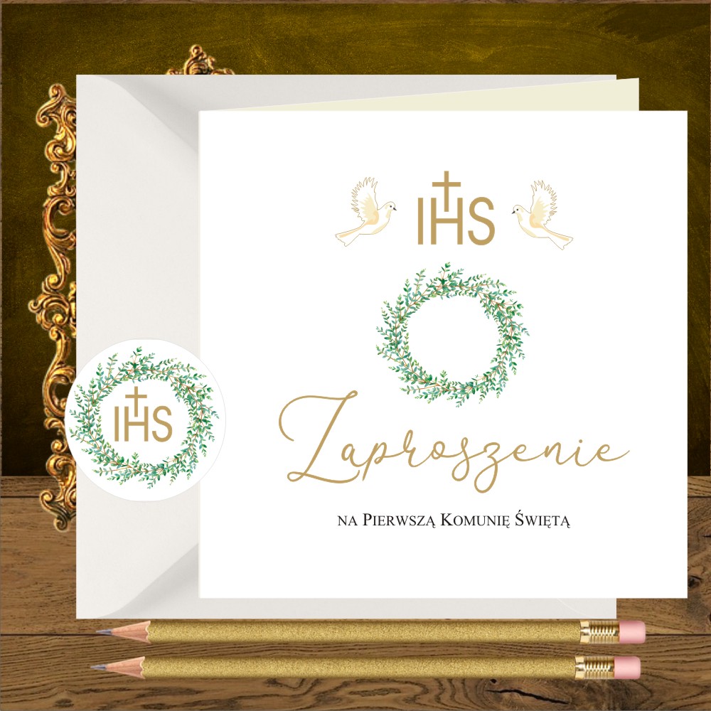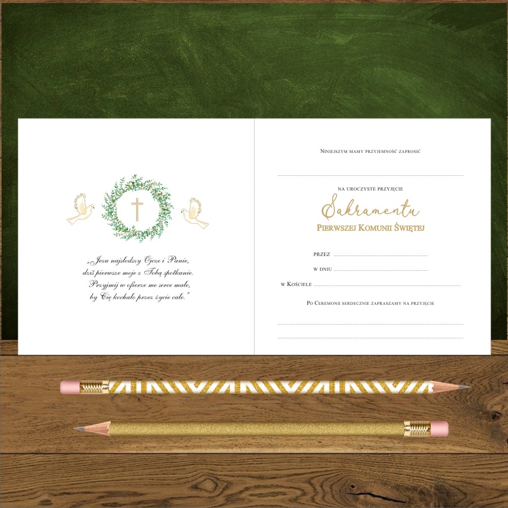 Kod wzoru: Zaproszenia komunijne do wypisania - Wianek zielone gałązki i gałąbki