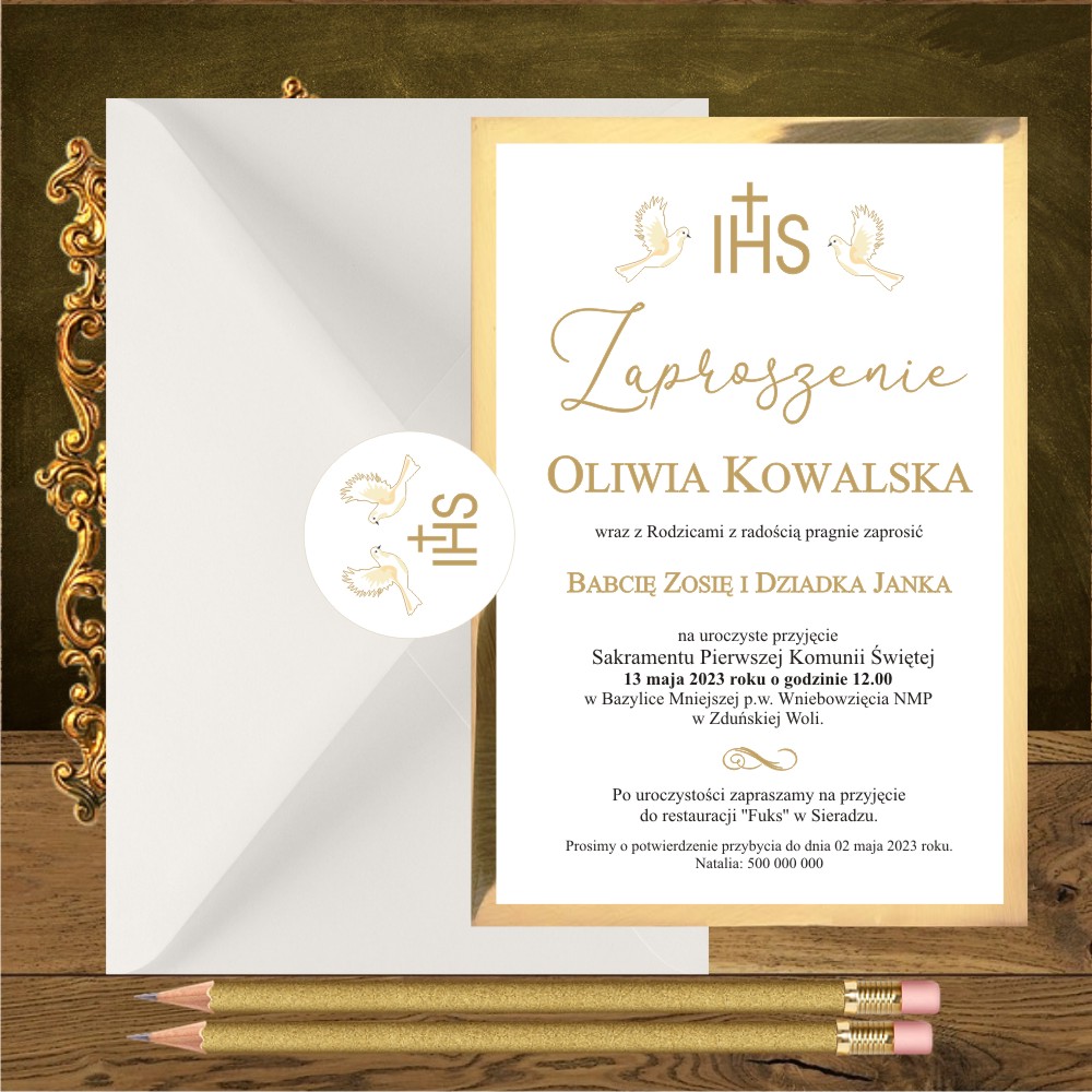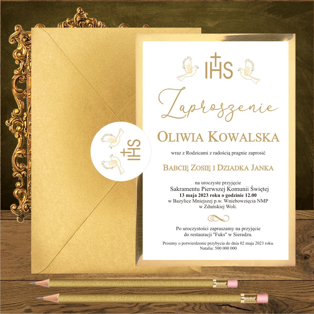Zaproszenia komunijne. Minimalistyczne . Klasyczne złote