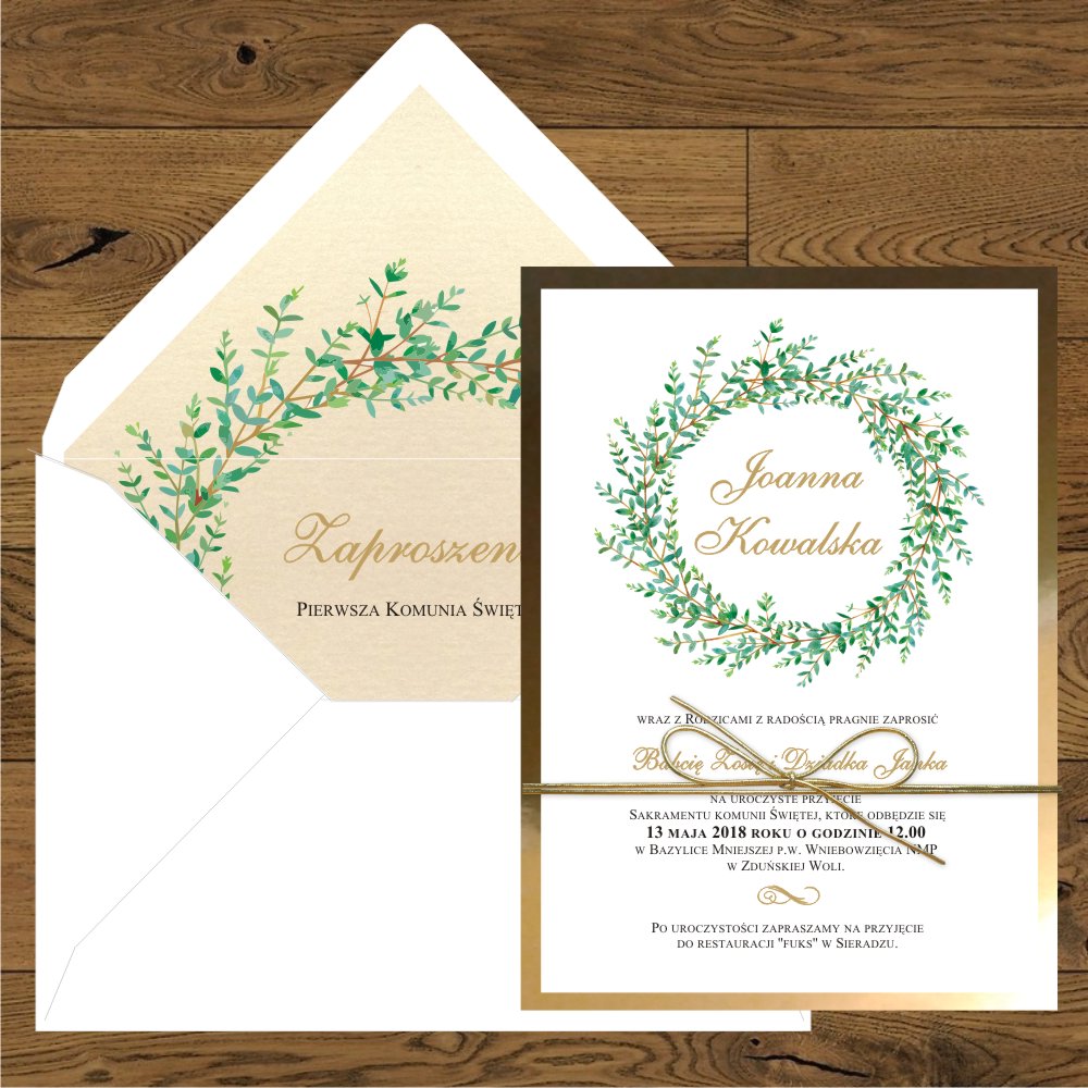 Zaproszenia na komunię proste. Wianek zielone galązki