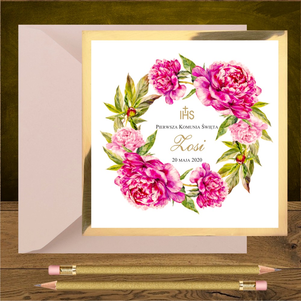 Zaproszenia komunijne rustykalne. Piwonie ciemny róż jednostronne złoty mirror