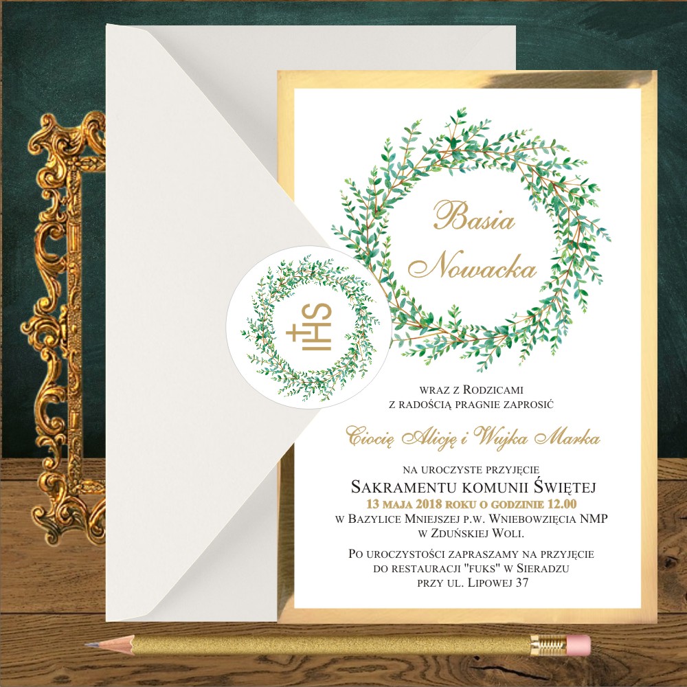 Kod wzoru: Zaproszenia komunia. Wianek zielone gałązki jednostronne na złoty mirror