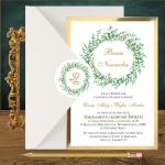 Zaproszenia na chrzciny. Wianek zielone gałązki. Jednostronne. Koperta wyklejana
