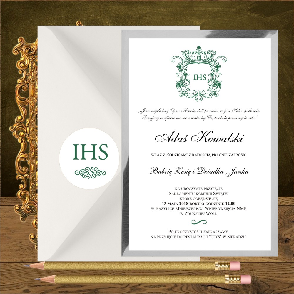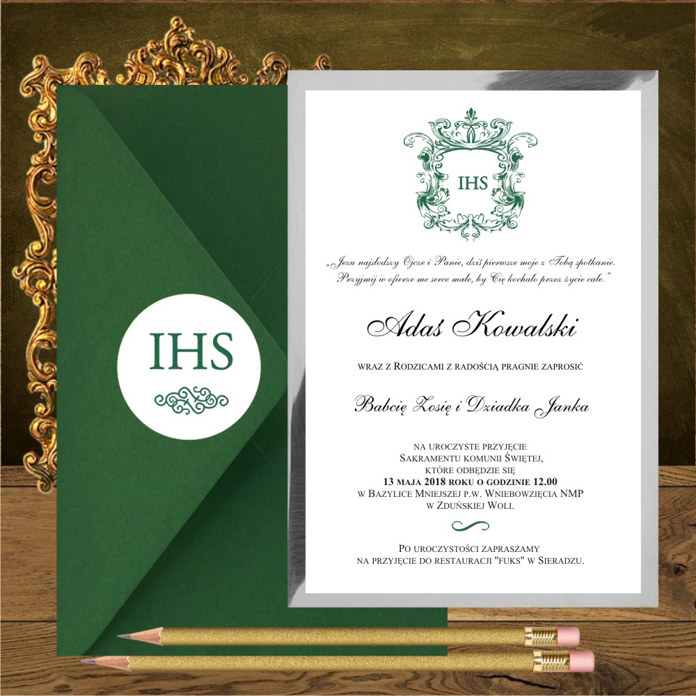 Kod wzoru: Zaproszenia komunijne Herb zielony jednostronne na srebrze