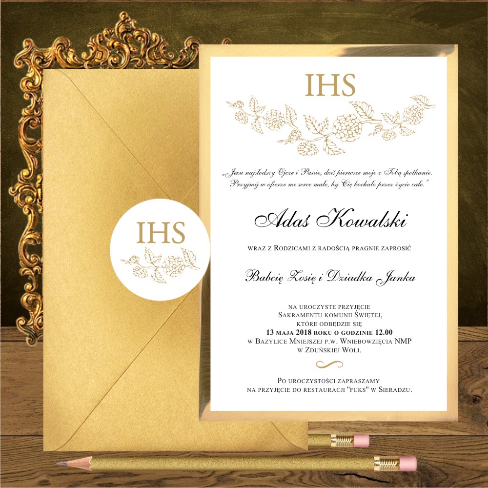 Kod wzoru: Zaproszenia komunijne jednostronne girlanda złota