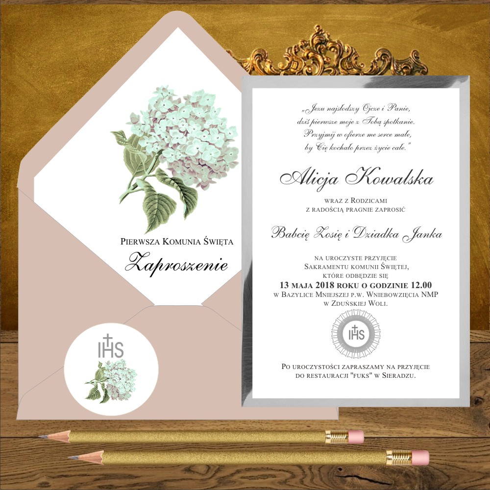 Kod wzoru: Zaproszenia komunijne jednostronne Hostia srebrna. Błekitna hortensja w wyklejeniu