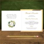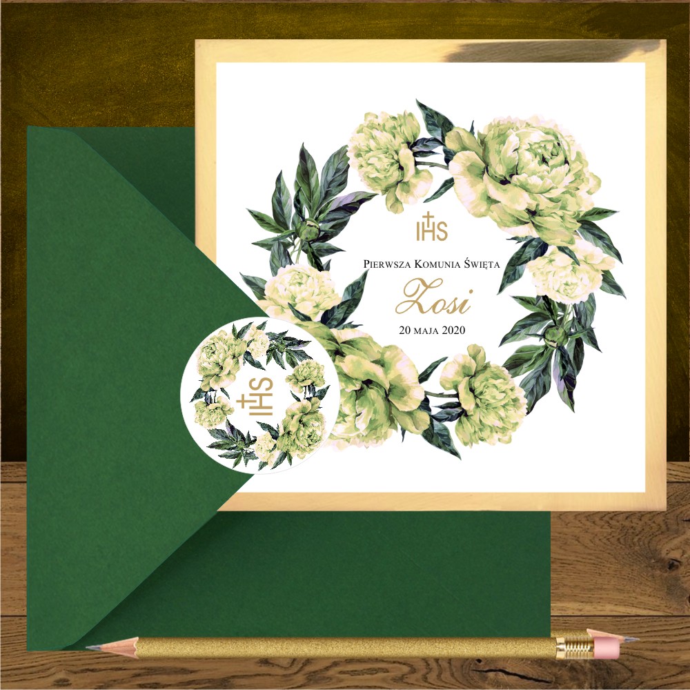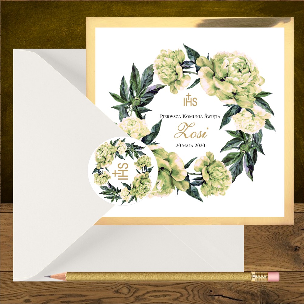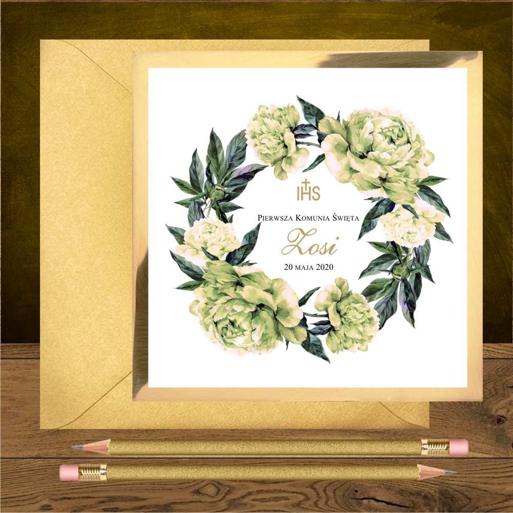 Zaproszenia komunijne. Piwonie ecru w wianku. Jednostronne złoty mirror