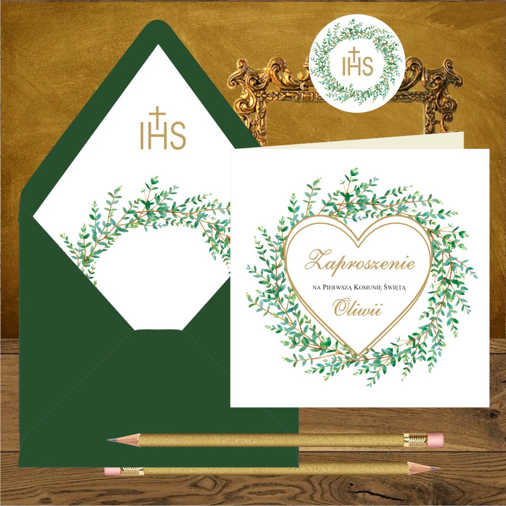 Kod wzoru: Zaproszenia komunijne Wianek zielone gałązki i serce Proste z wyklejeniem