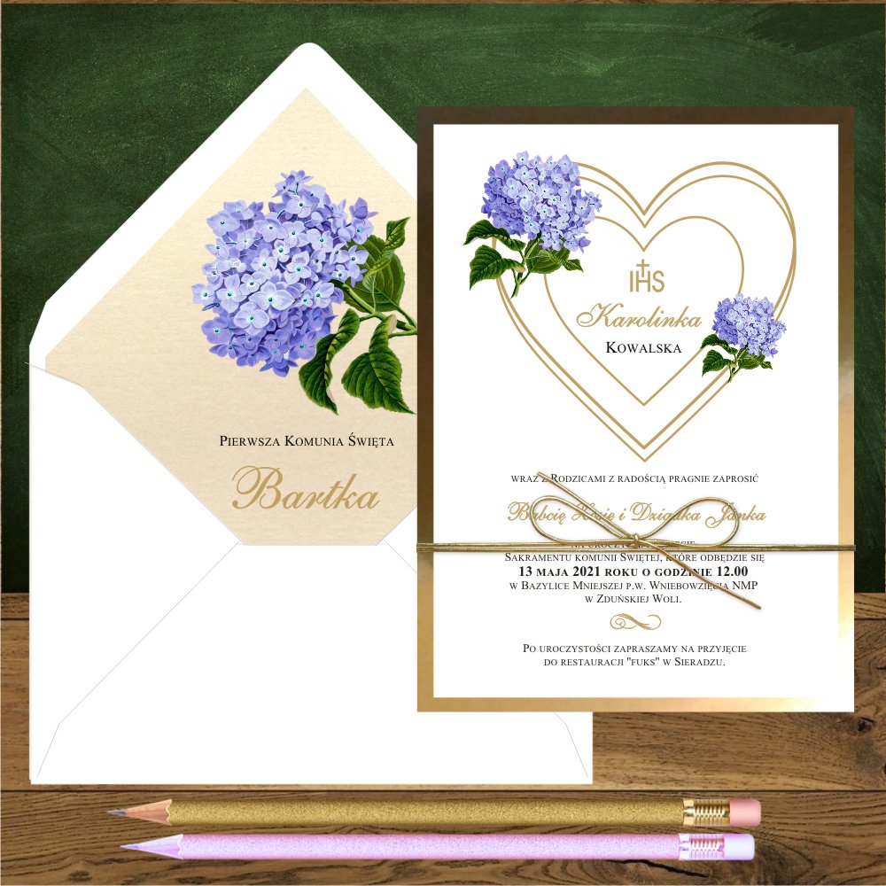 zaproszenia na komunię z niebieskimi hortensjami kwadratowe