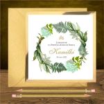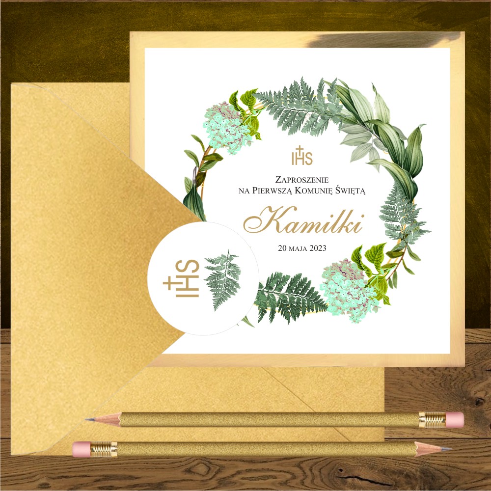 Zaproszenia komunijne w saszetce. Zielony ogród złoty mirror