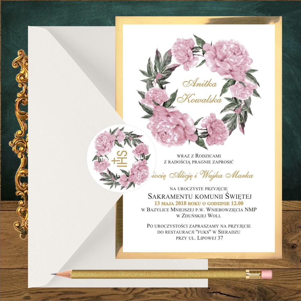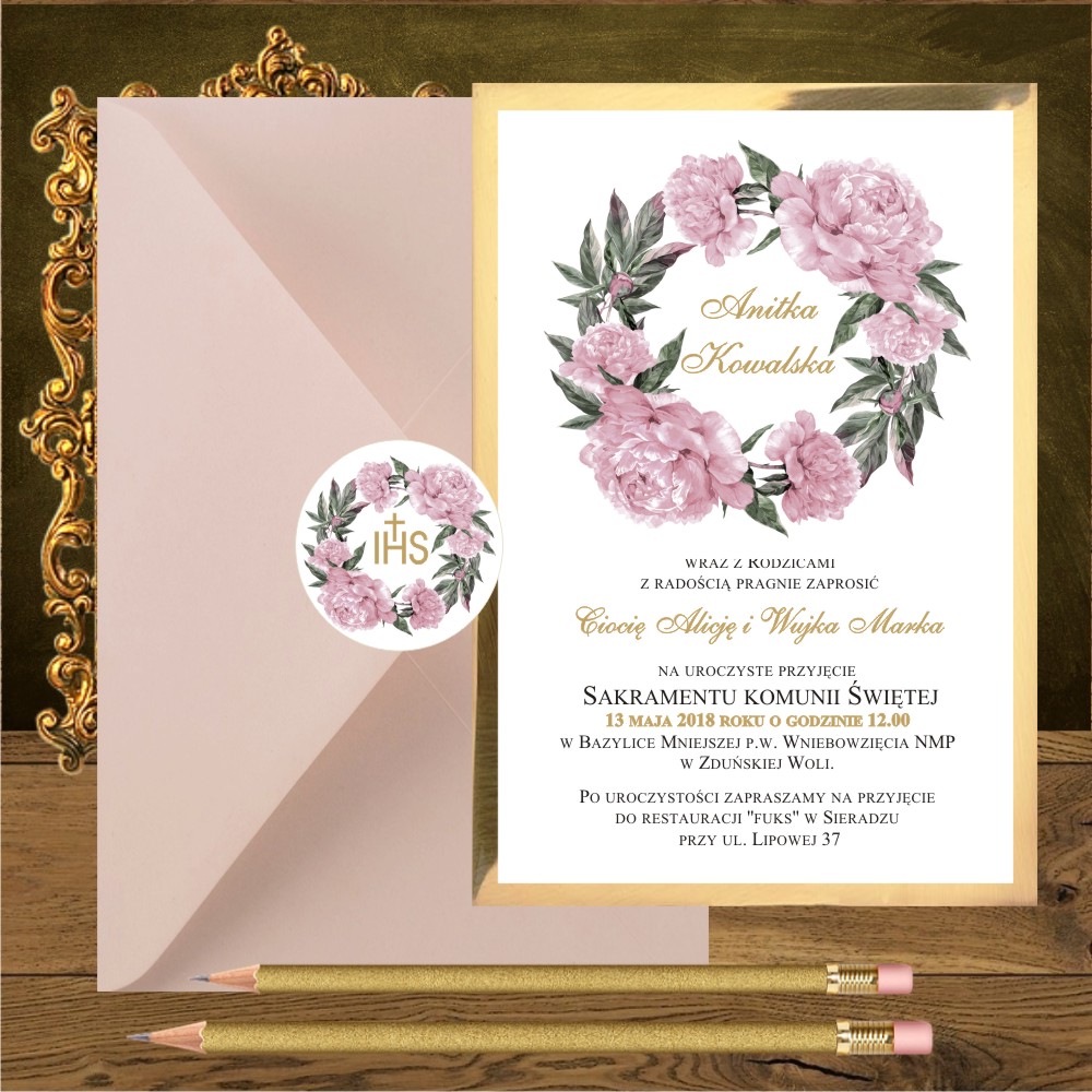 Zaproszenia komunijne. Piwonie jasny róż w wianku. Kwadratowe złoty mirror