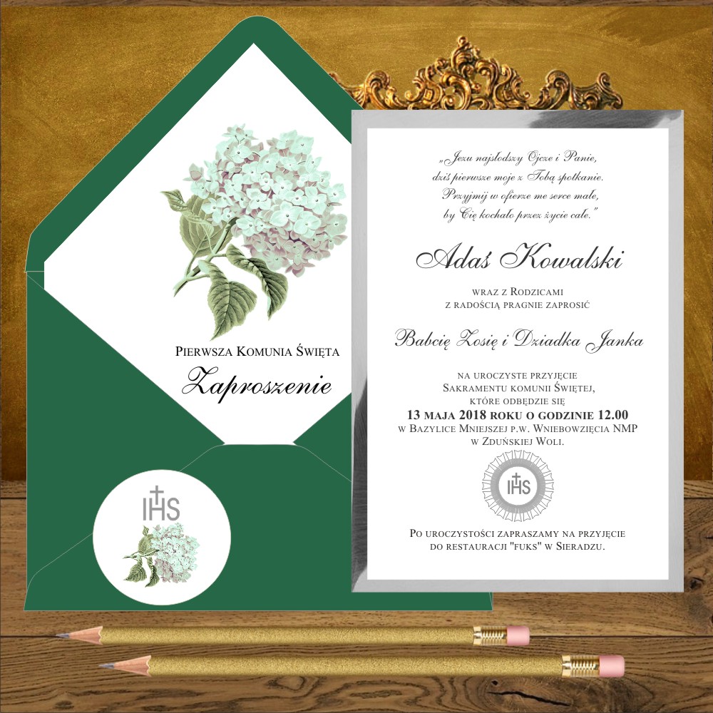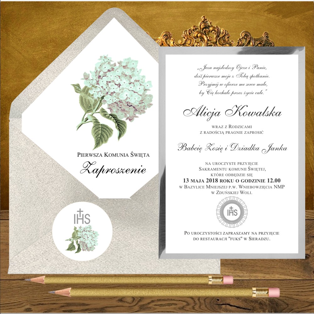 Kod wzoru: Zaproszenia na komunię jednostronne Hostia srebrna. Błekitna hortensja w wyklejeniu