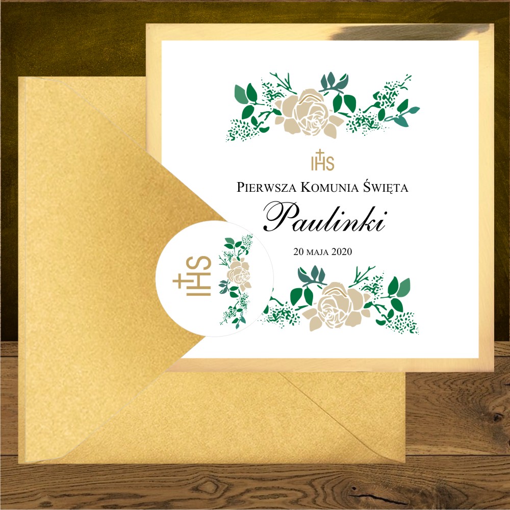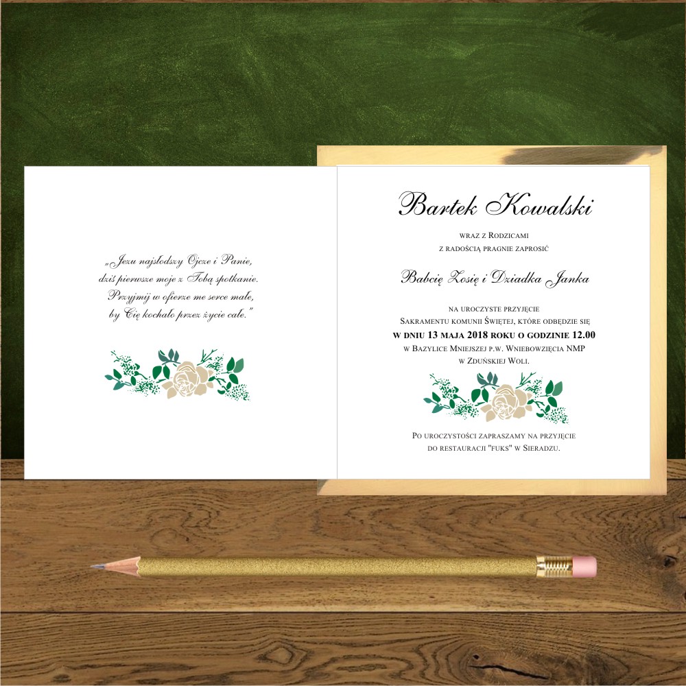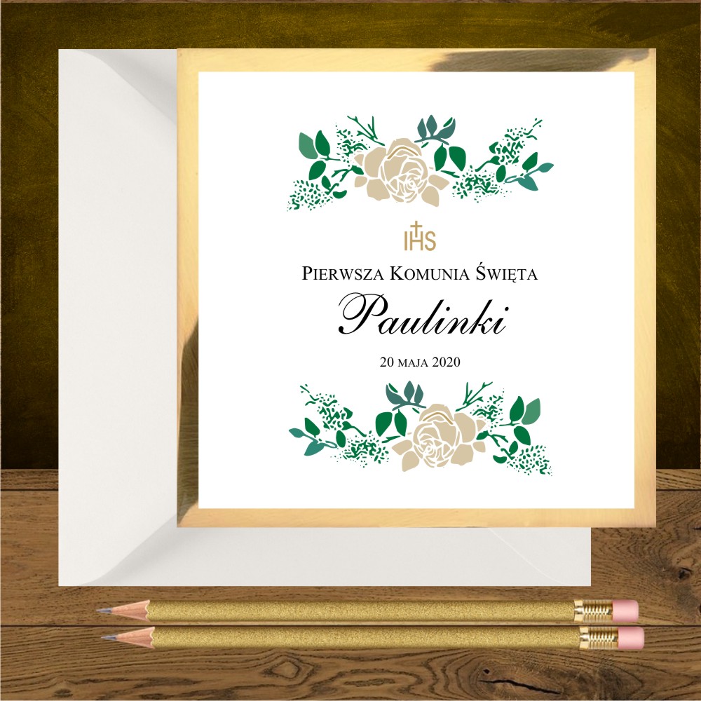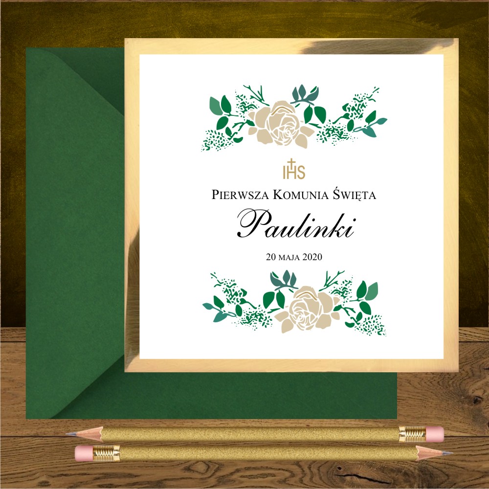 Kod wzoru: Zaproszenia na Komunię Świętą Glamour. Róże złote i zielone