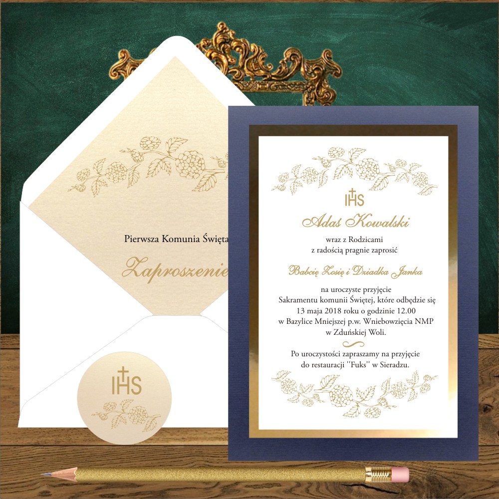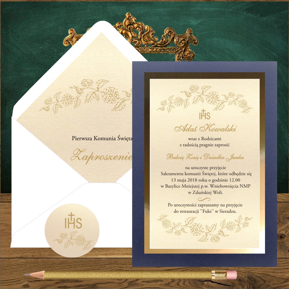 Kod wzoru: Zaproszenia na komunię. Złote girlandy na granatowym tle