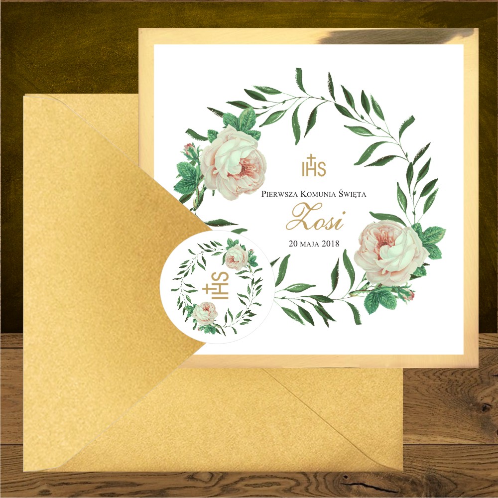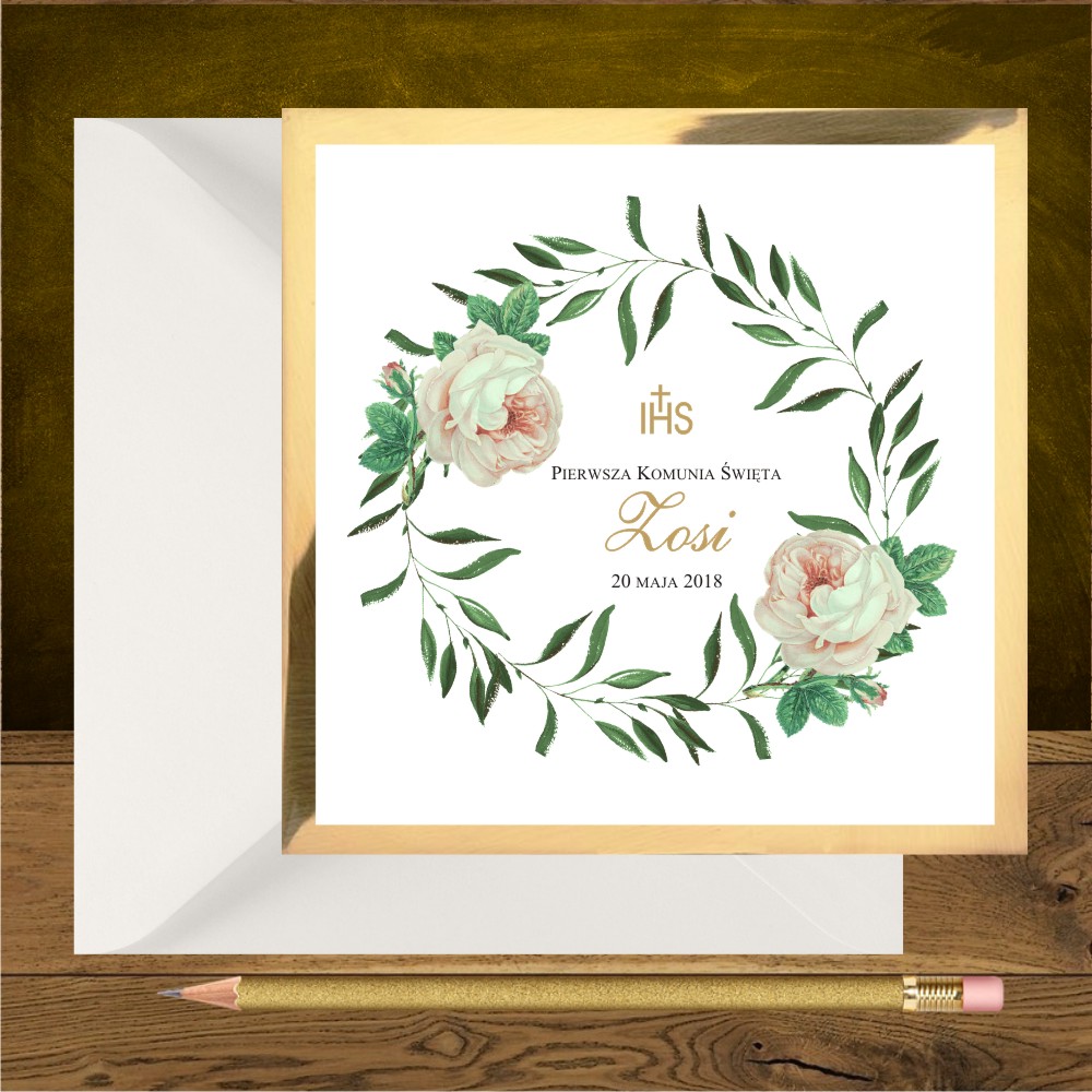 Kod wzoru: Zaproszenie komunijne glamour. Zielone listeczki i dwie róże ecru